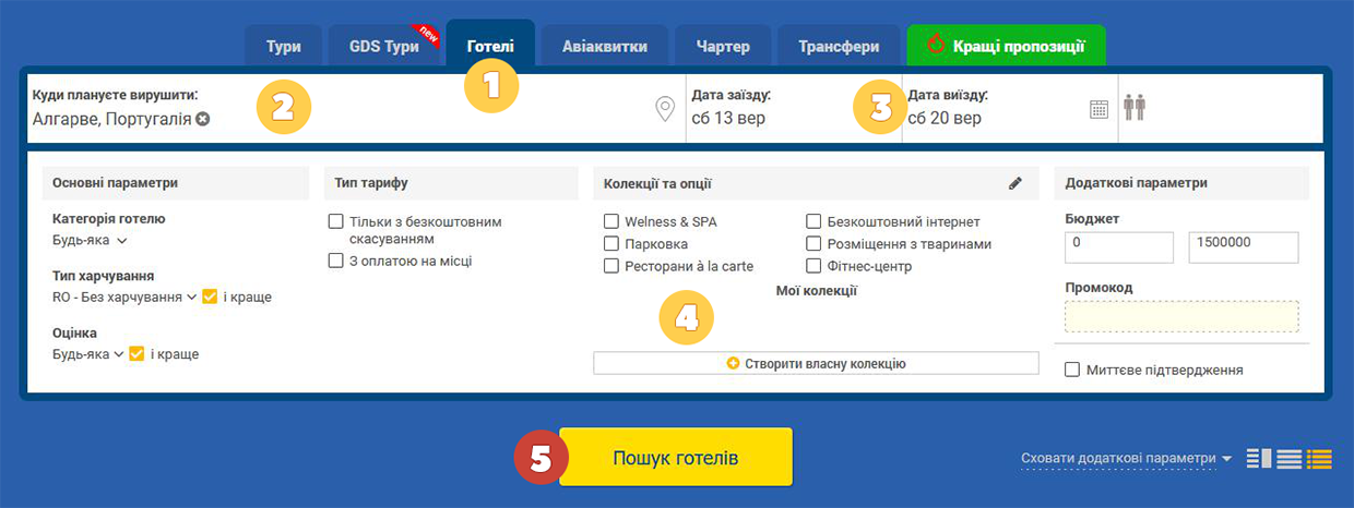 Після внесення необхідної інформації слід клікнути на кнопку «Пошук готелів» під формою пошуку або відповідну піктограму та дочекатися отримання результатів.